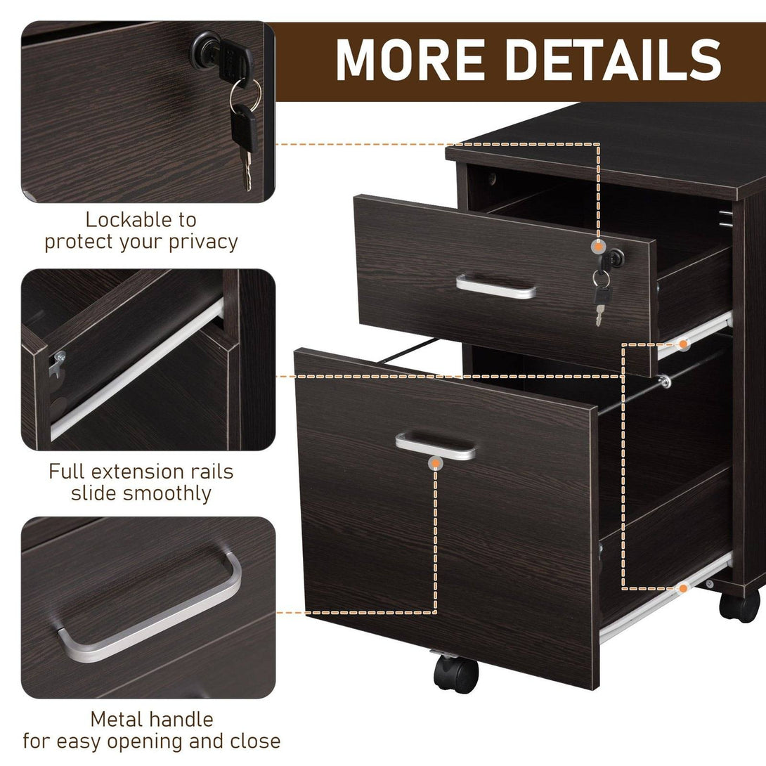 Blending storage space and a compact size into a stylish design, this filing cabinet from Vinsetto is made to make you fall in love with your office space once again. It features a small top drawer and a large bottom drawer to give you all the room needed for files and stationery. There is a rail in the bottom drawer for hanging your files for efficient filing and organization. Five wheels for easy movement - two of which can be locked to keep the unit in place when needed.