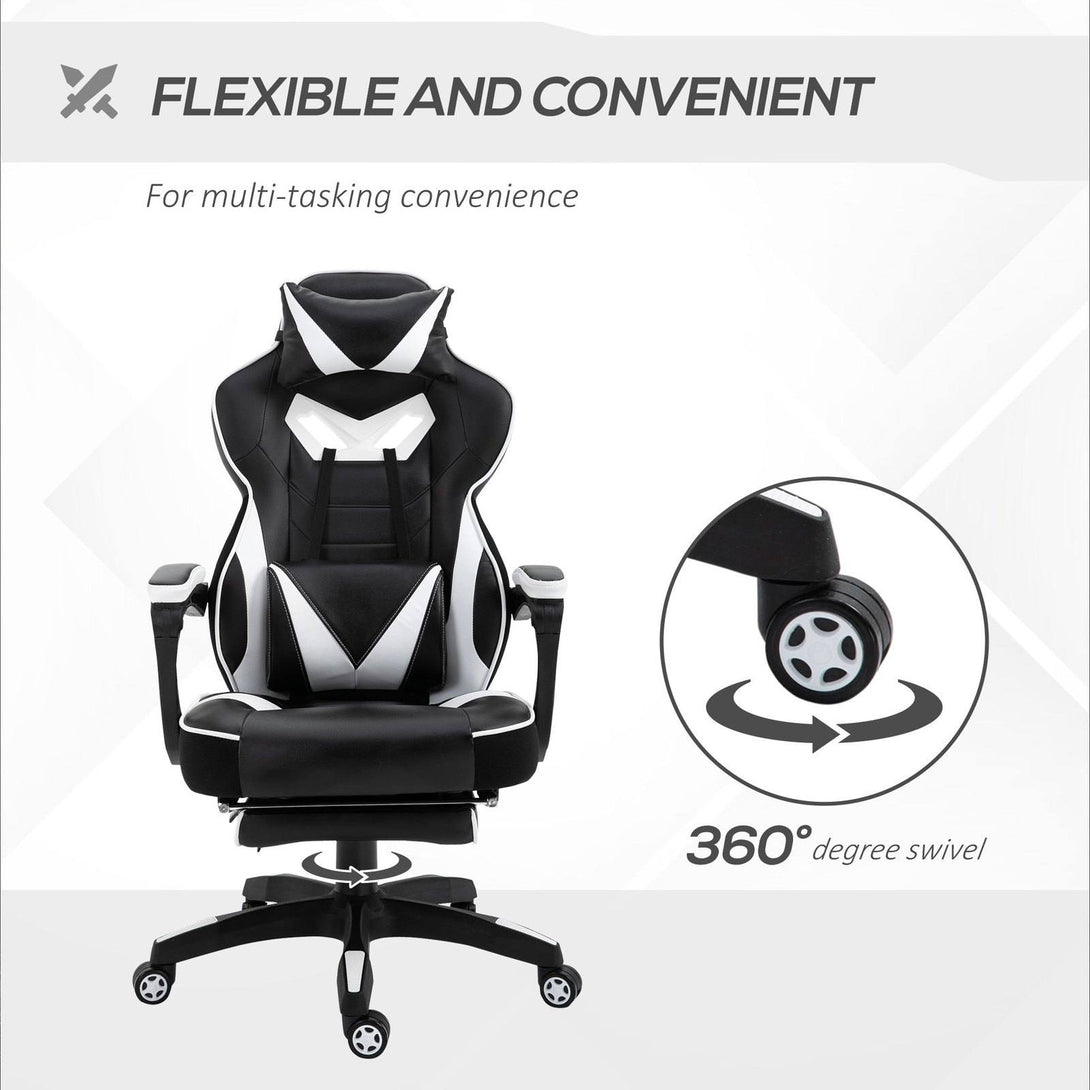 Fulfil your need for some serious style with this gaming chair with footrest from Vinsetto. It's fitted with thick sponge for comfort and wrapped in sleek faux leather with contrasting panels. Comfortable in design, it features a high back, armrests, a five-wheel base and can swivel around 360°. Whether it's work or play, the gaming chair for adults is a good choice.