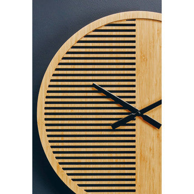 This wall clock, featuring a striking design with half of the dial showcasing sleek horizontal cutouts. This unique detail adds depth and texture, contrasting beautifully with the smooth surface and bold black hands, making it a standout piece for modern interiors.