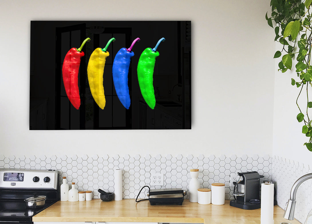 Vivid Chilis acrylic print, UV printed onto 5mm thick acrylic glass. Comes with everything you need to hang on your wall.