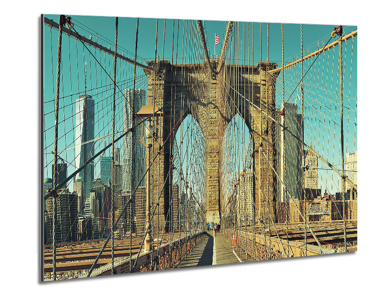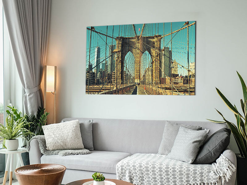 Walking Through The Brooklyn Bridge Printed on brushed aluminium dibond. A modern way to display art and easy to maintain.