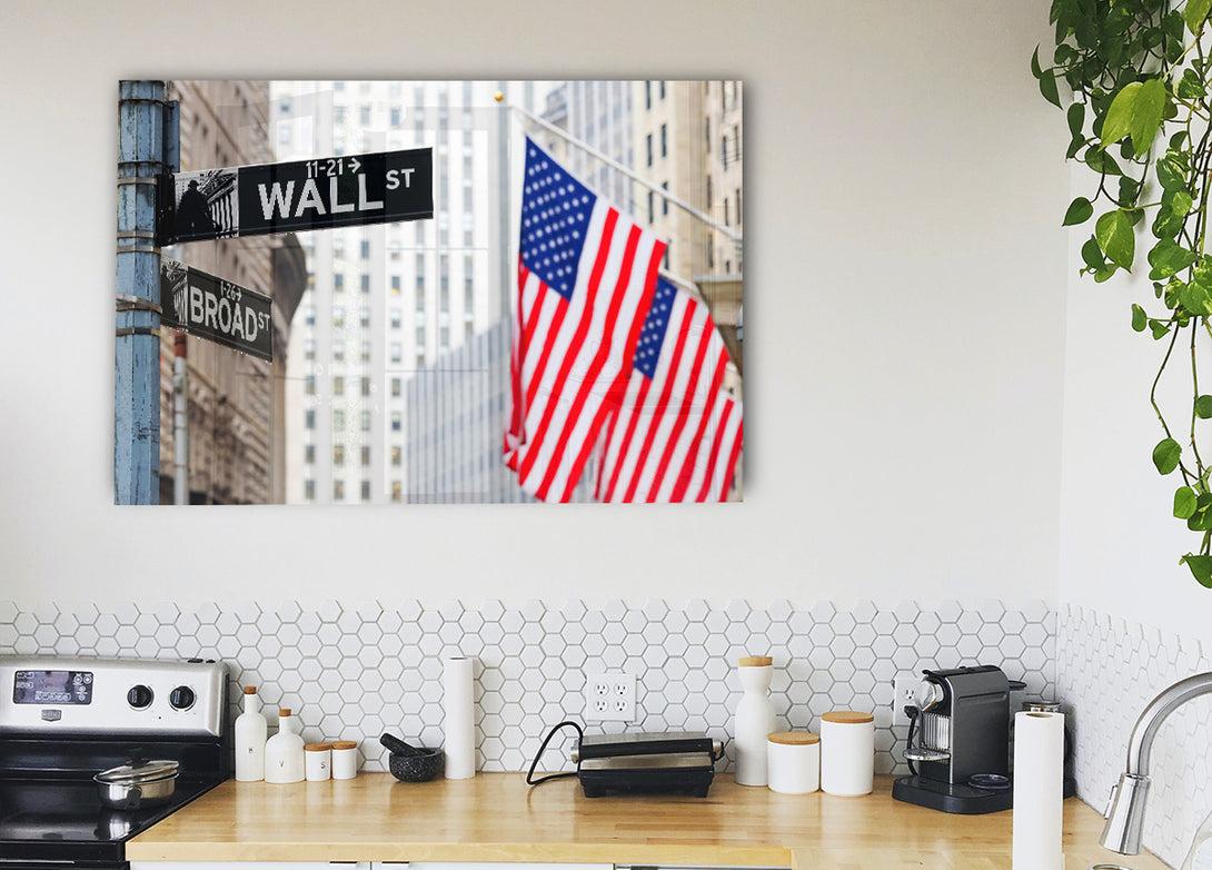 Wall Street American Flags acrylic print, UV printed onto 5mm thick acrylic glass. Comes with everything you need to hang on your wall.