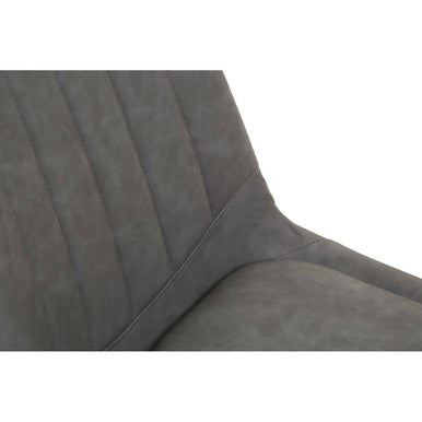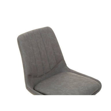 The Westford dining set boasts a modern style featuring a wood-effect rectangular top table with angled black metal legs. The contrast of a brown tabletop and black metal legs creates a contemporary and sophisticated look. The six dining chairs are upholstered in grey faux leather and are cushioned for added comfort. The chairs complement the table's modern style with their clean lines and sleek silhouette.