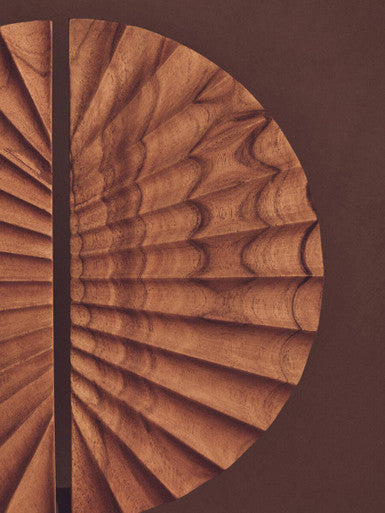 This Westo sculpture is handcrafted by skilled artisans, featuring a carved natural wood disc with a radiating, segmented design. Each segment curves outwards from a central split opening, creating a dynamic sense of movement and texture. The sculpture is mounted on a contrasting, solid travertine base boasting a porous tactile surface further enhancing the organic charm. *Due to the inherent nature of natural materials and the handmade process, slight variations in colour, grain and texture may occur.