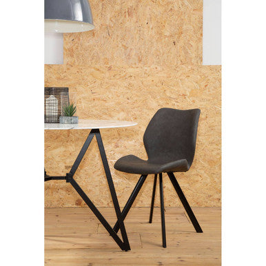 This 7pc dining set features a round table with a white marble top that contrast the sleek hairpin legs. Each chair has a dark grey curved back complemented with black finish angular legs that further the sophistication.