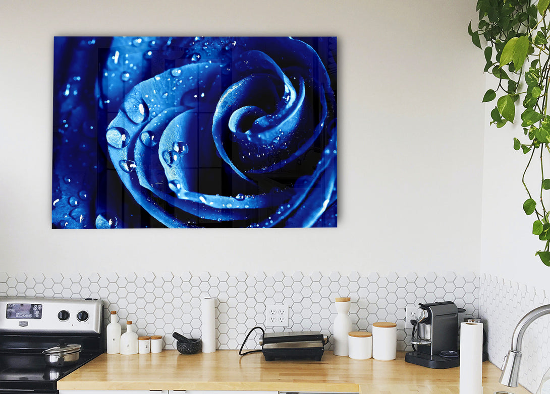 Wet Drops Blue Rose acrylic print, UV printed onto 5mm thick acrylic glass. Comes with everything you need to hang on your wall.