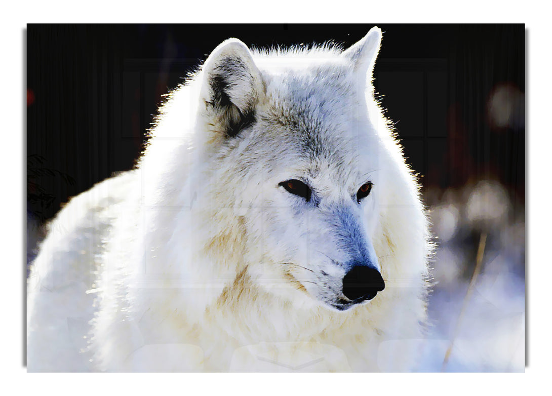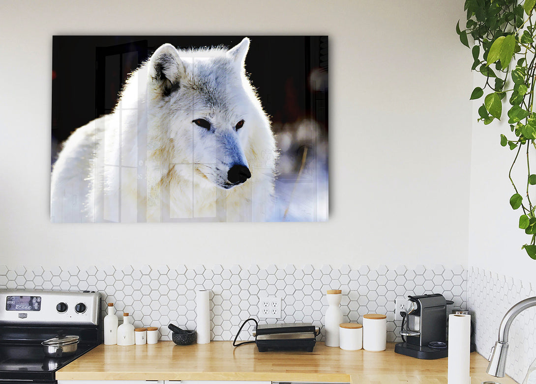 White Arctic Wolf acrylic print, UV printed onto 5mm thick acrylic glass. Comes with everything you need to hang on your wall.