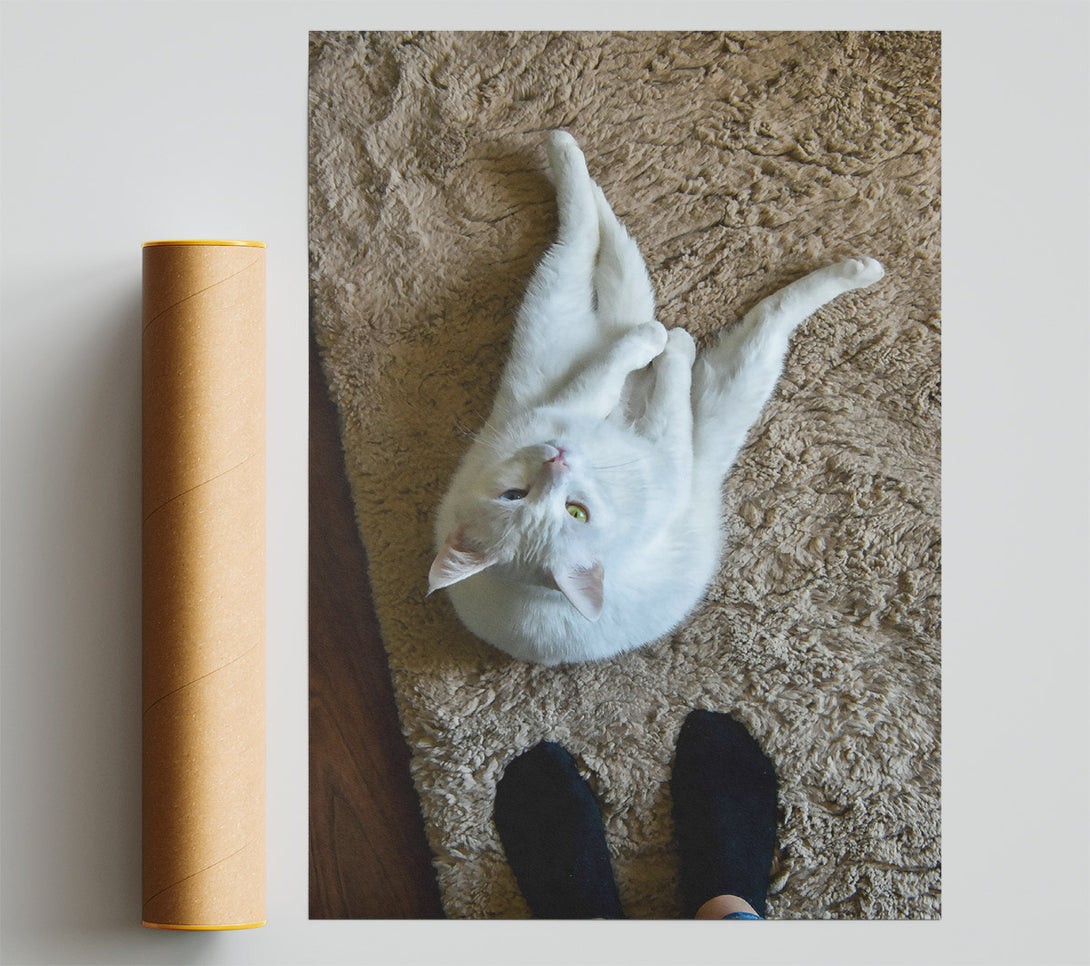 Our White Cat On Tan Rug Poster is printed 260 GSM premium lustre paper that offers vibrant colours and exceptional detail.