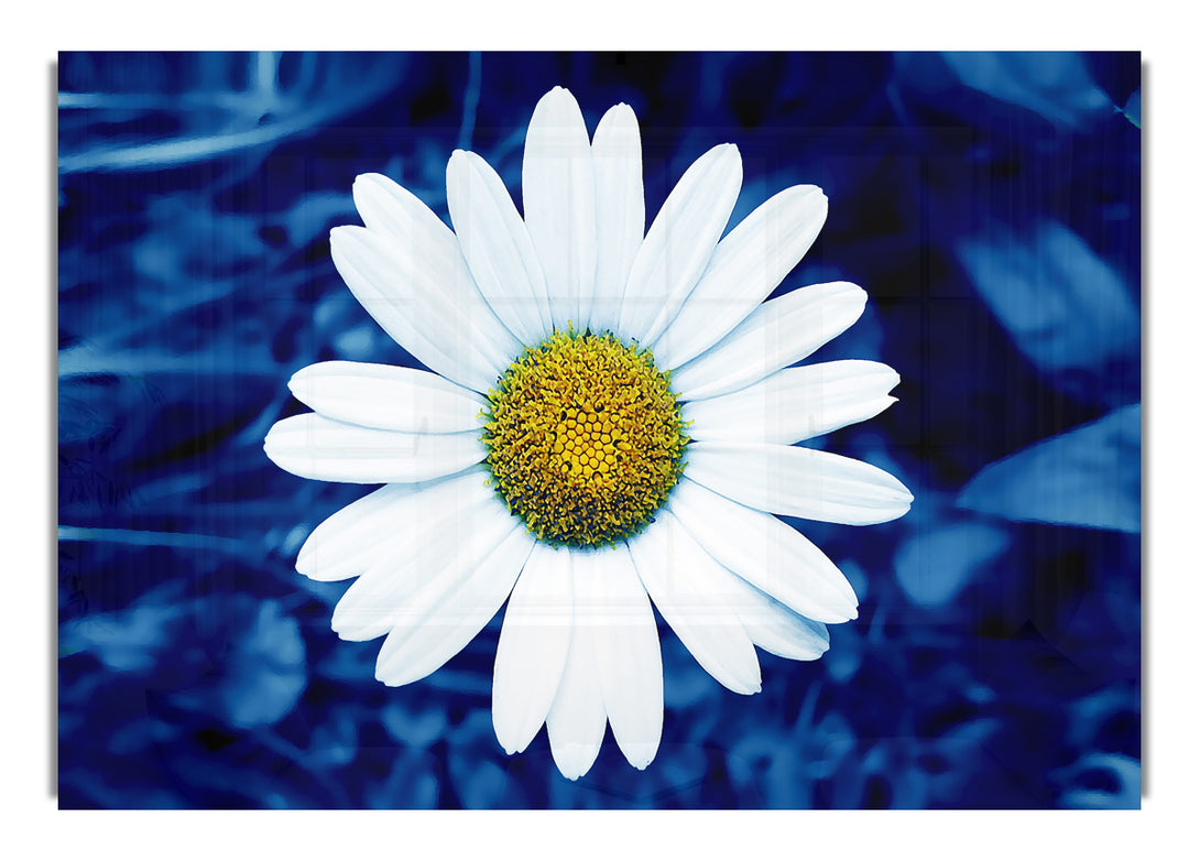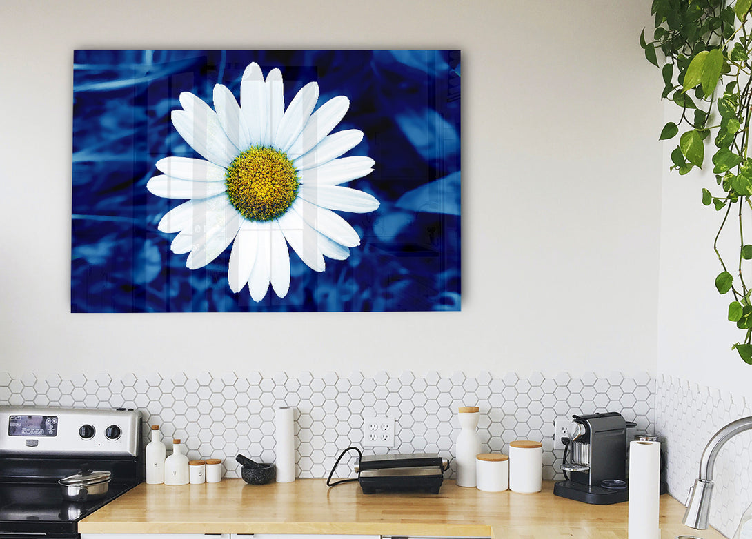 White Daisy Face On Blue acrylic print, UV printed onto 5mm thick acrylic glass. Comes with everything you need to hang on your wall.