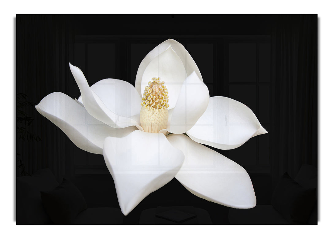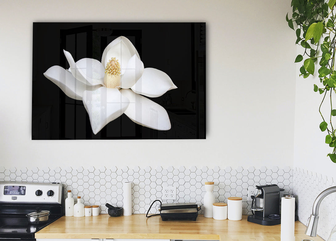 White flower on black delicate acrylic print, UV printed onto 5mm thick acrylic glass. Comes with everything you need to hang on your wall.