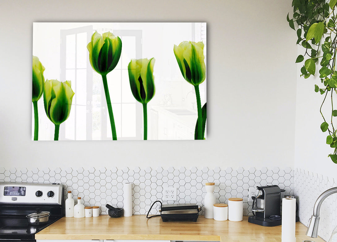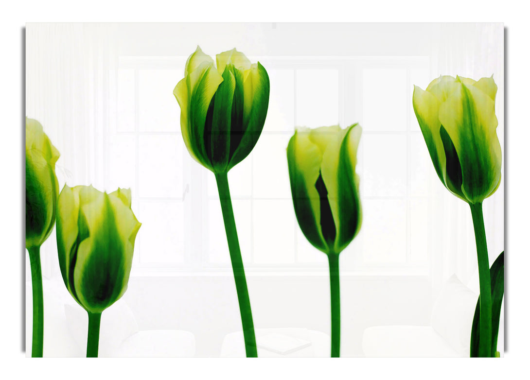 White Green Tulip Parade acrylic print, UV printed onto 5mm thick acrylic glass. Comes with everything you need to hang on your wall.