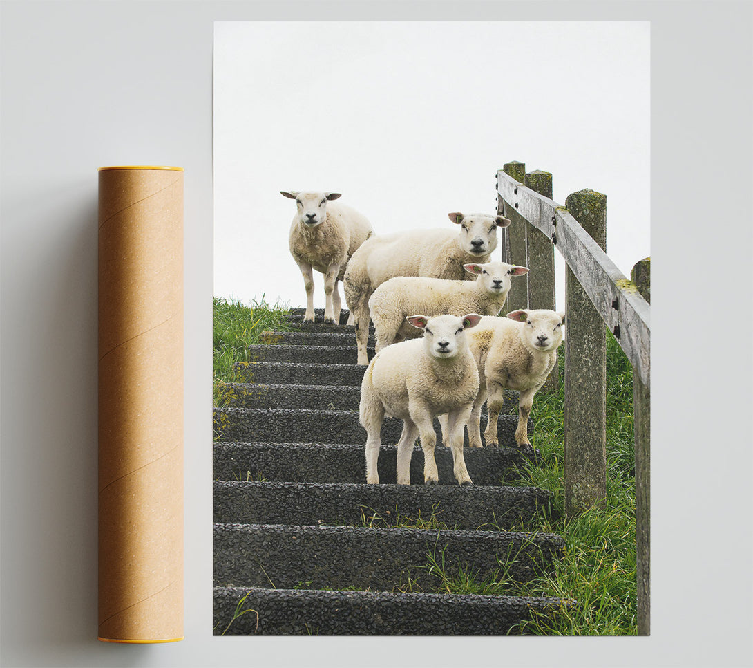 Our White Sheep On Black Stairs Poster is printed 260 GSM premium lustre paper that offers vibrant colours and exceptional detail.
