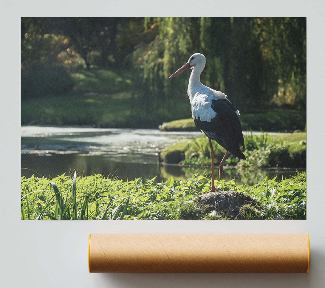 Our White Stork By The Pond. Poster is printed 260 GSM premium lustre paper that offers vibrant colours and exceptional detail.