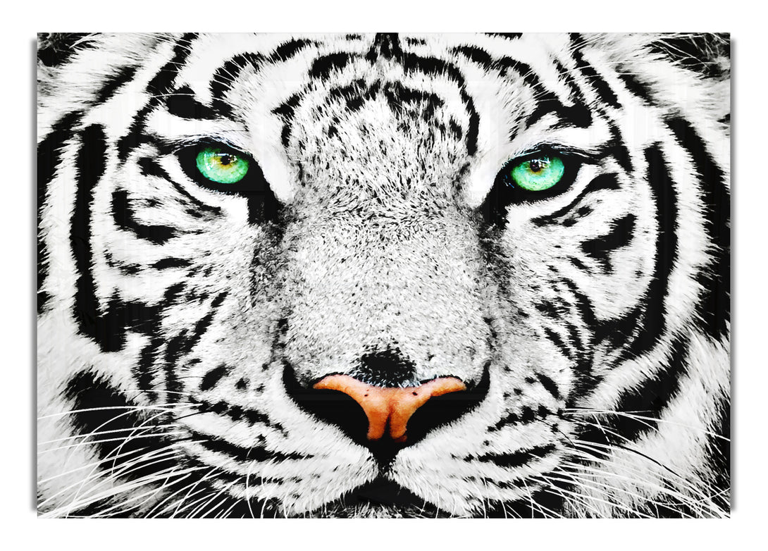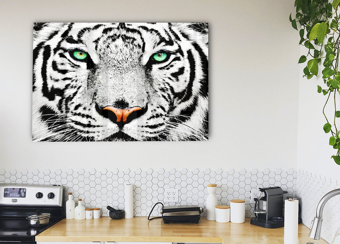 White Tiger Face acrylic print, UV printed onto 5mm thick acrylic glass. Comes with everything you need to hang on your wall.