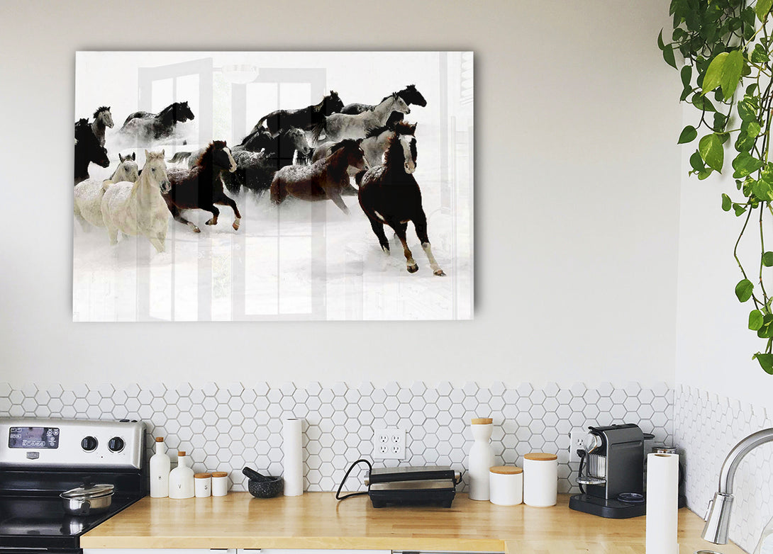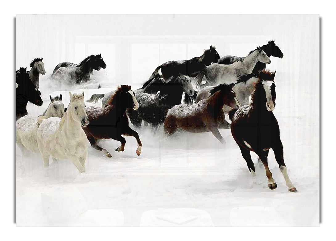 Wild Horses In The Snow acrylic print, UV printed onto 5mm thick acrylic glass. Comes with everything you need to hang on your wall.