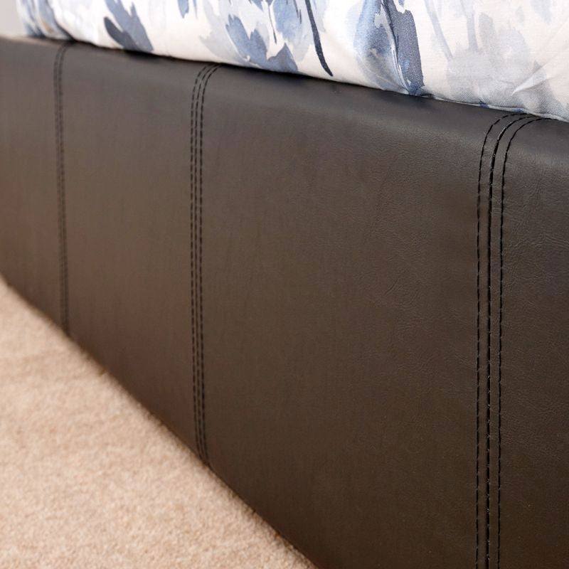 This stunning black faux leather end lift ottoman bed offers an attractive combination of contemporary style and ample storage space. This beautifully crafted frame is finished in high quality Black faux leather and complemented by a simple yet stylish stitched headboard. This is an ideal solution if space is at a premium in your bedroom as the ottoman base provides generous storage space for linen, blankets, towels or clothes. The base lifts easily with the help of a gas hydraulic system so you can access the lined storage area underneath the bed. Part of the Winston Collection.