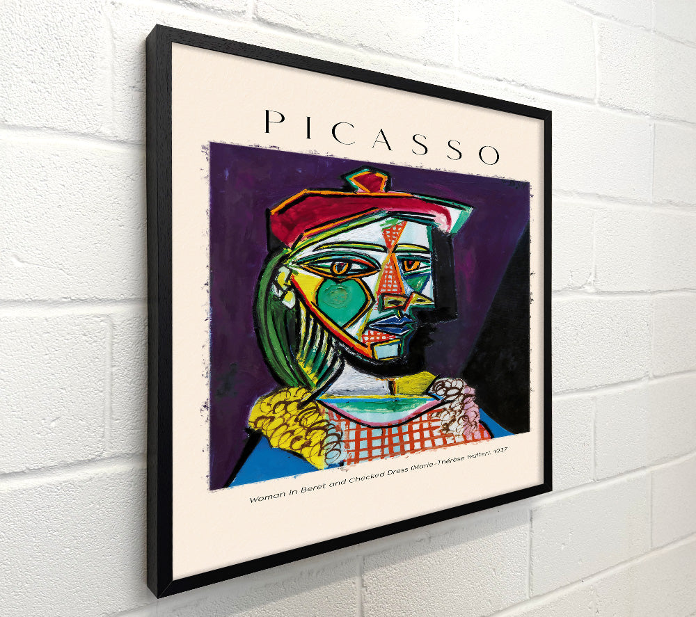 Woman In Beret And Checked Dress 1937 By Picassocanvas square canvas, printed on coated polyester canvas. Mounted on to a 44mm box frame, ready to hang.