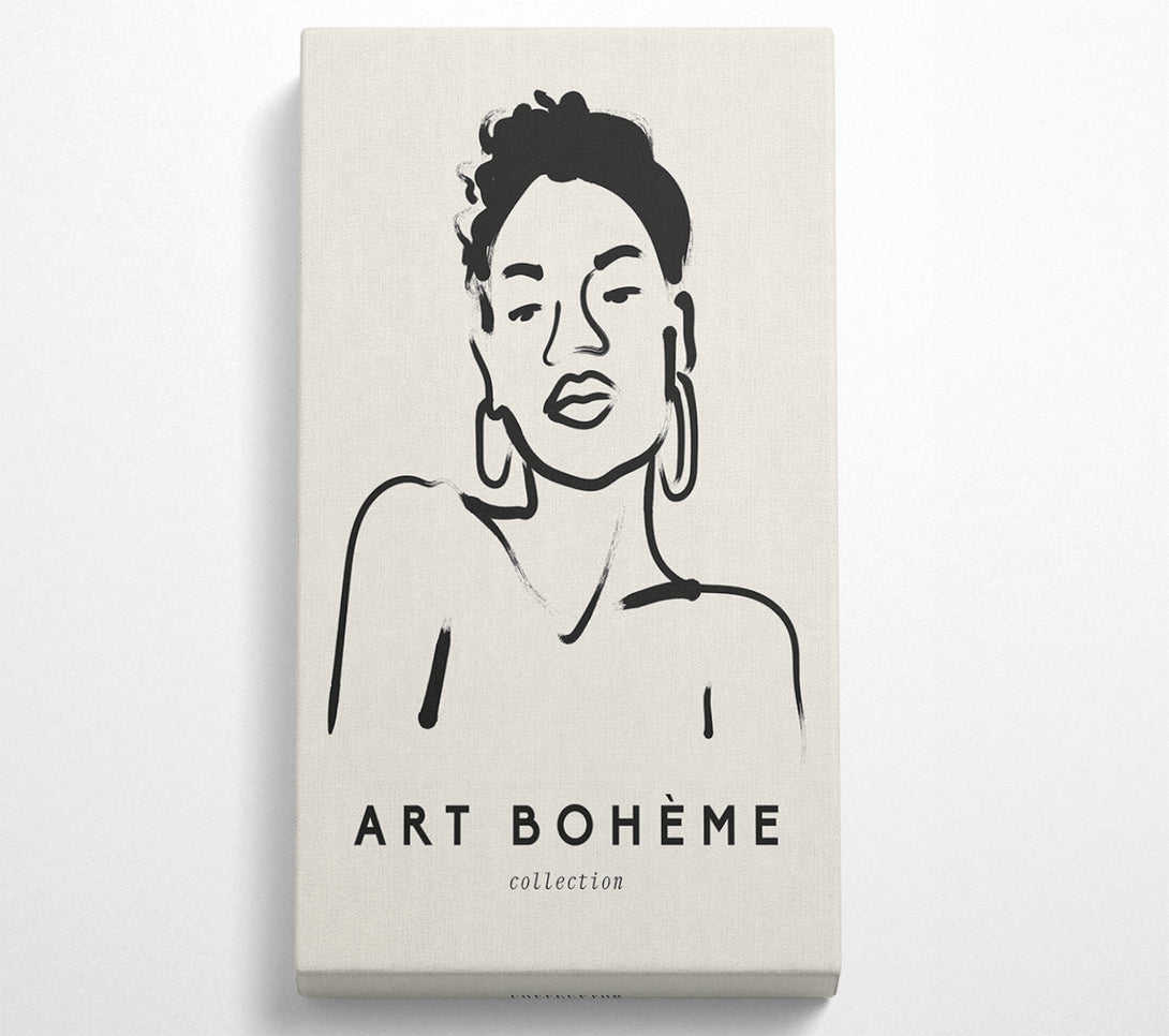 Woman With Earrings wide canvas, printed on coated polyester canvas. Mounted on to a 44mm box frame, ready to hang.