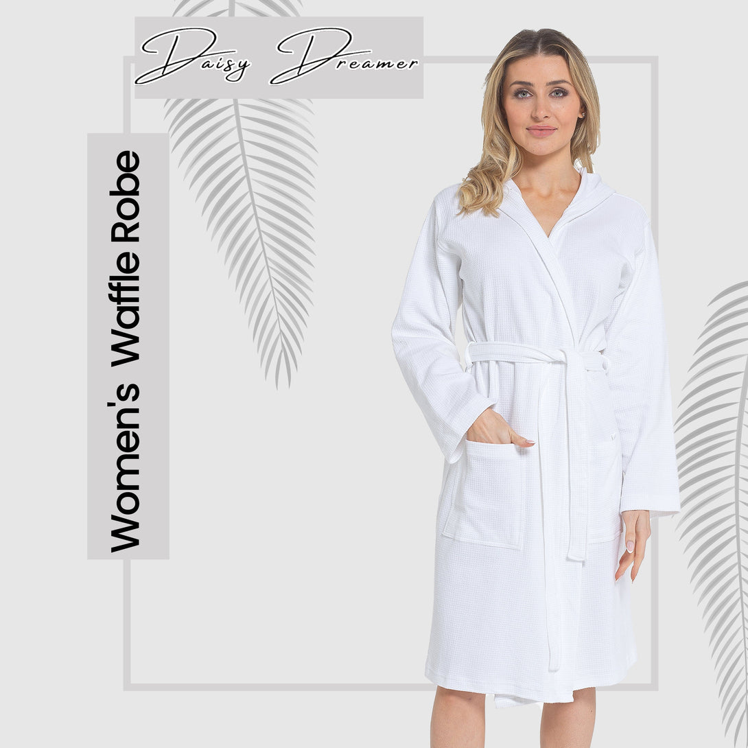 Women's Hooded Waffle Cotton Bathrobe White Super Absorbent Spa Dressing Gown for Home Lounge & Travel by Daisy Dreamer