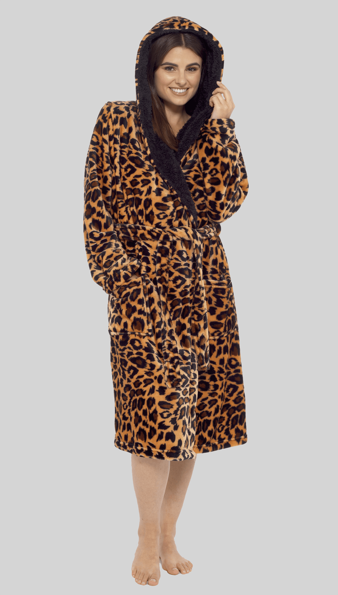 Women's Leopard Plush Fleece Hooded Robe with Sherpa Lining Warm Nightwear UK Sizes 8-22 by Daisy Dreamer