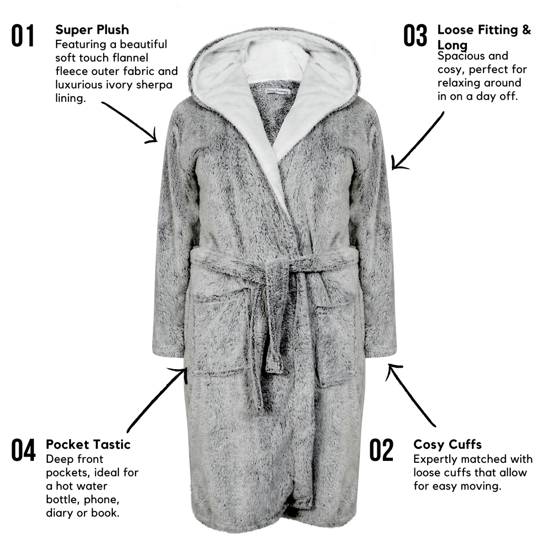 Women's Shimmer Grey Plush Fleece Hooded Robe Dressing Gown, Sherpa Lined