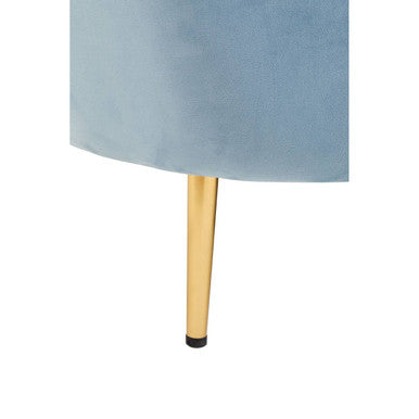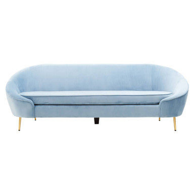 This three seater will add a touch of sophistication to any room with soft aqua blue velvet upholstery, while the curved shape creates an inviting aesthetic. Resting atop tapered gold finish legs, this sofa creates a modern art deco aesthetic.