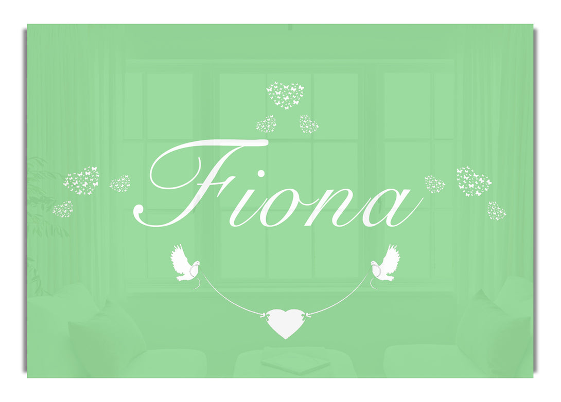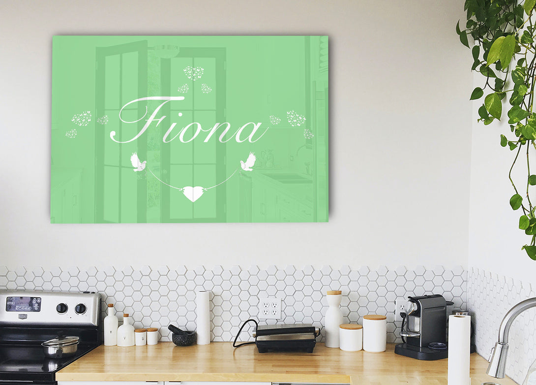 Your Name In Hearts Green acrylic print, UV printed onto 5mm thick acrylic glass. Comes with everything you need to hang on your wall.
