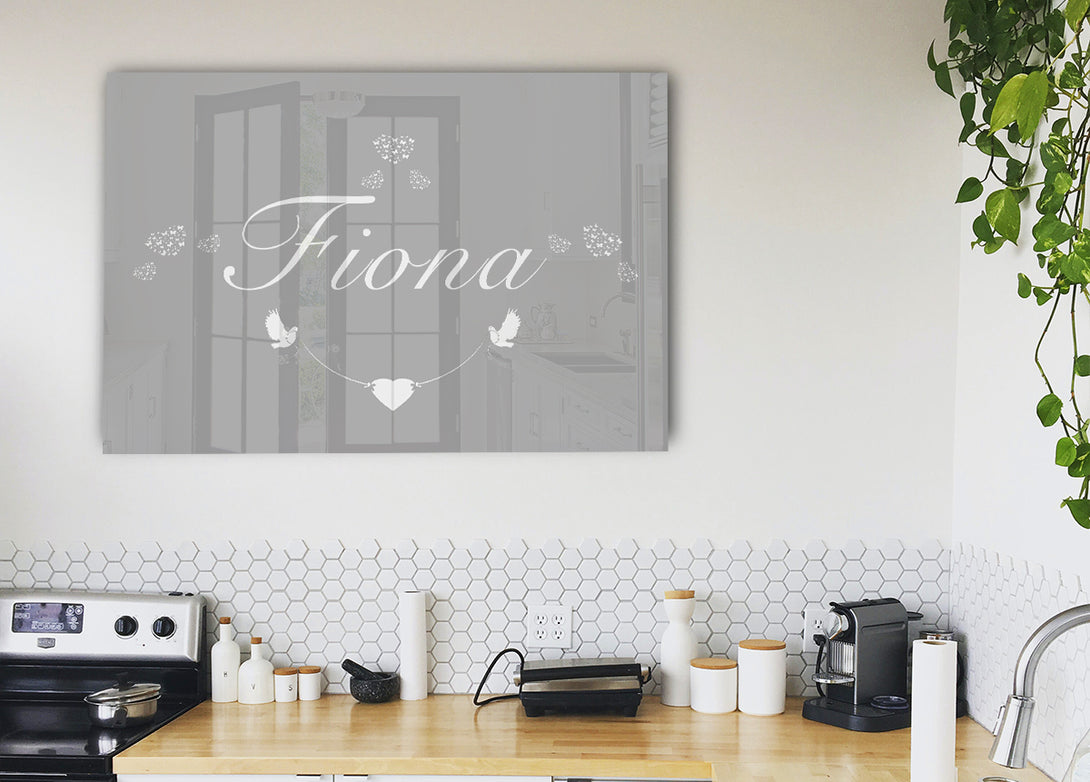 Your Name In Hearts Grey White acrylic print, UV printed onto 5mm thick acrylic glass. Comes with everything you need to hang on your wall.