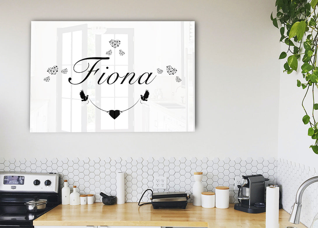Your Name In Hearts White acrylic print, UV printed onto 5mm thick acrylic glass. Comes with everything you need to hang on your wall.