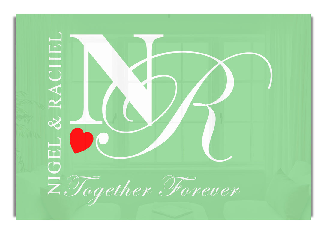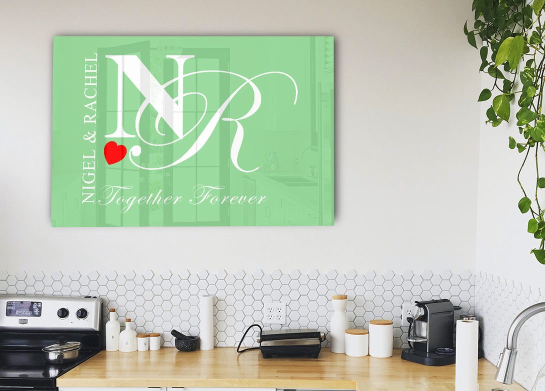 Your Names And Initials Together Forever Green acrylic print, UV printed onto 5mm thick acrylic glass. Comes with everything you need to hang on your wall.