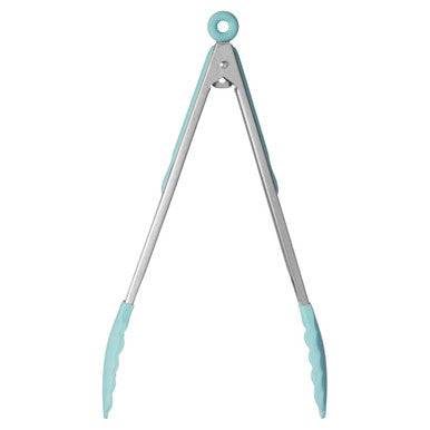 These light green tongs feature a durable stainless steel build. A circular sliding lock mechanism allows them to be held securely in position. The silicone grips are odour and stain resistant and have a scalloped design for easy picking up of items.